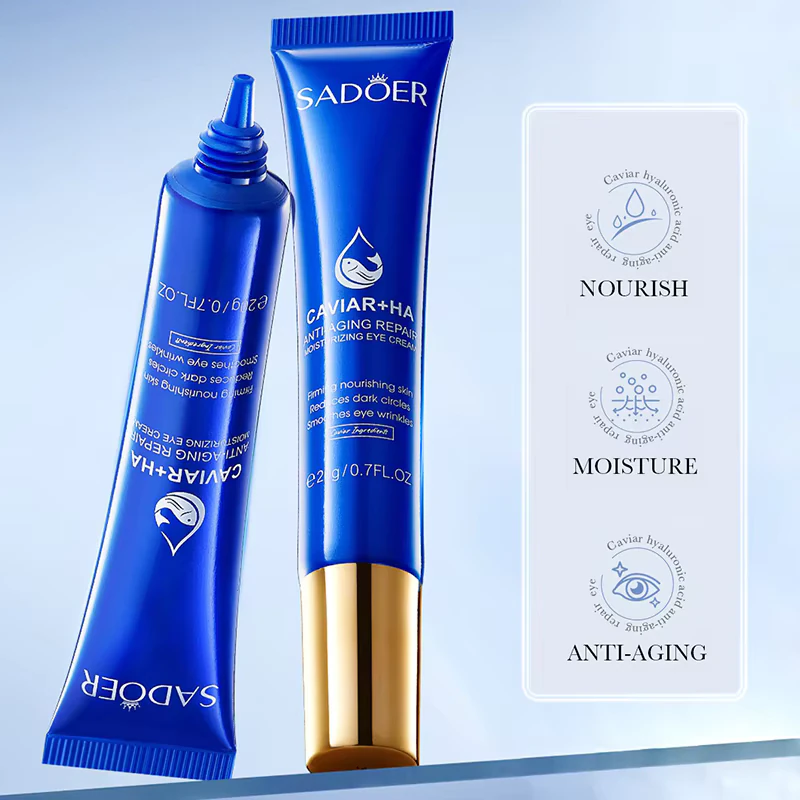 SADOER Caviar Hyaluronic Acid Eye Cream tube and box set for anti-aging and hydration.SADOER Caviar Hyaluronic Acid Eye Cream